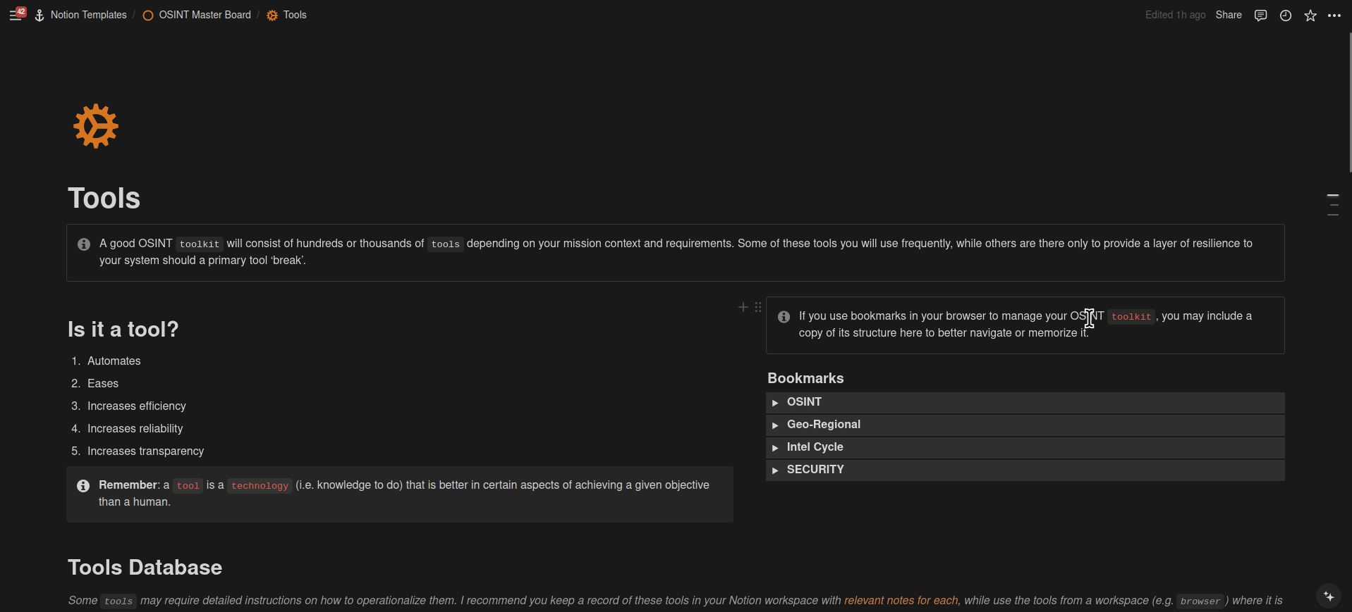 - Tools — building a toolkit is part of being an OSINTer; it is an elemental experience that familiarizes you with the means and methods of the tradecraft, while forcing you to learn about technology, methodology, case-studies and more; while all this can be overwhelming at first, your Tools database will aid you keep track of your tools, while also holding notes that you can turn to when in doubt about how best to use a given technology.